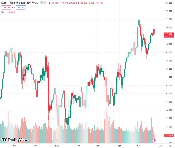 EURJPY currently trading at 149.27 at the time of writing. Pair opened at 149.87 and is trading with a change of -0.4 % .