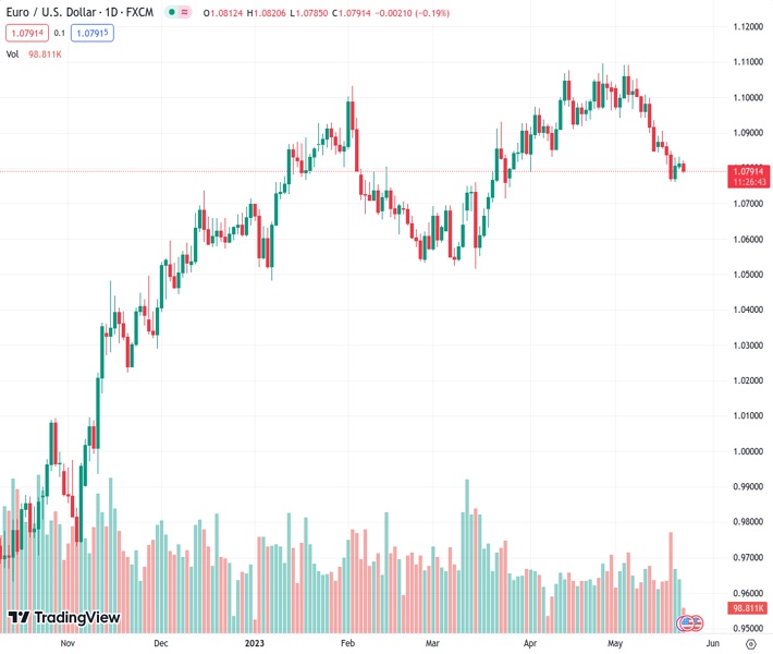 “Despite the correction in EUR/USD from nearly 1.11 to 1.08, net speculative long Euro positioning still seems quite stretched, and presents an outside risk in EUR/USD to the 1.05 area should conditions drive it there. Such conditions could include serious speculation over another couple of Fed rate hikes (only another 10 bps of hikes is currently priced) or severe dislocation in US money markets if the US Treasury gets very close to an unthinkable default on its debt. Neither of those is our baseline view and instead EUR/USD probably hangs around this 1.08 area for a while.”