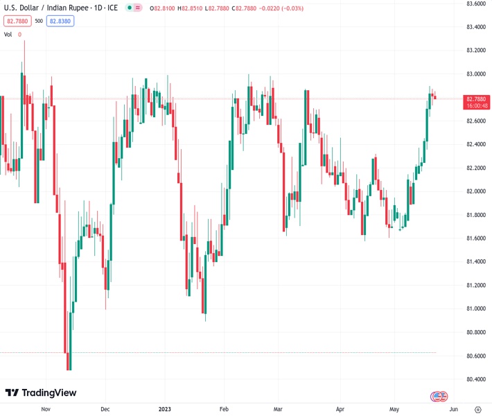 The USD/INR pair is displaying a back-and-forth action above 82.80 in the Asian session. The major is struggling to find direction as the US Dollar Index (DXY) remained choppy overnight amid a lack of clarity over the US debt-ceiling issues.