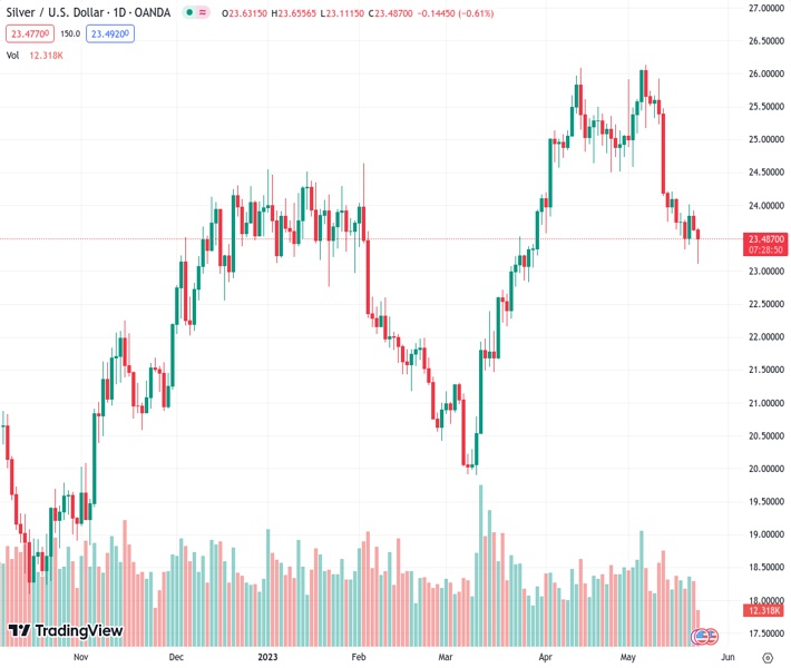 XAGUSD currently trading at 23.35 at the time of writing. Pair opened at 23.64 and is trading with a change of -1.23 % .