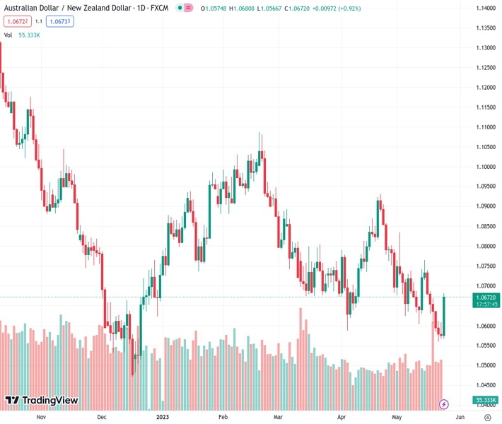 AUDNZD currently trading at 1.0576 at the time of writing. Pair opened at 1.0578 and is trading with a change of -0.02 % .