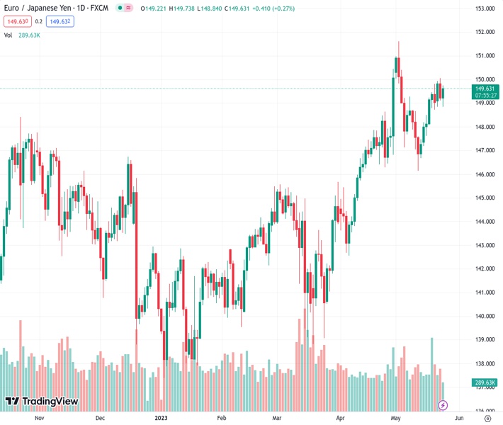 EURJPY currently trading at 149.3 at the time of writing. Pair opened at 149.25 and is trading with a change of 0.03 % .