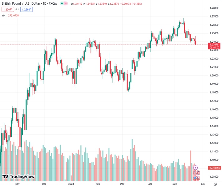 As of writing, the pair is losing 0.04% at 1.2406 and faces the next support at 1.2364 (monthly low May 24) followed by 1.2344 (weekly low April 10) and finally 1.2274 (monthly low April 3). On the other hand, the surpass of 1.2668 (2023 high May 8) would open the door to 1.2864 (200-week SMA) and then 1.3000 (psychological level).