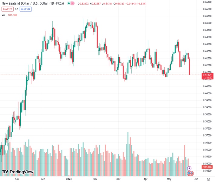 NZDUSD currently trading at 0.6135 at the time of writing. Pair opened at 0.6248 and is trading with a change of -1.81 % .
