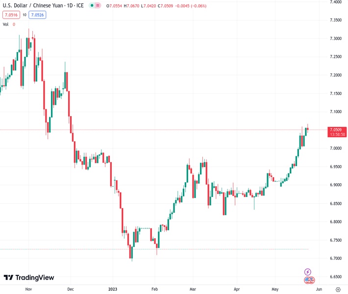 “With the USD turning stronger and the Chinese recovery from covid lockdowns underwhelming, we see a strong case for further upside, with next resistance seen at 7.0843, then the 78.6% retracement of the 2022/23 fall at 7.1982.”