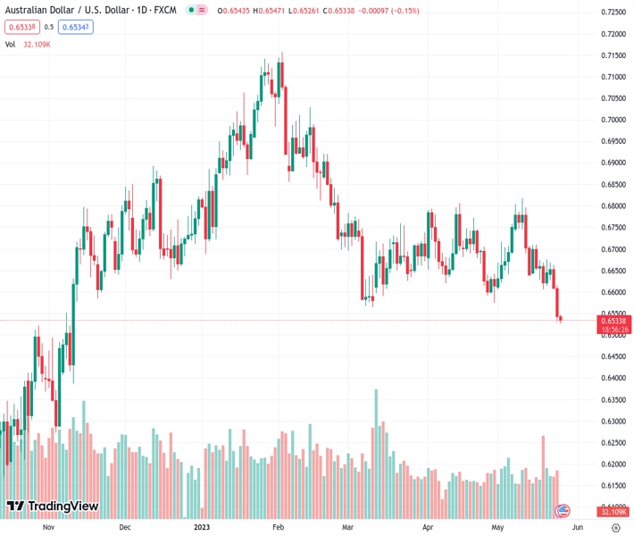 AUDUSD currently trading at 0.6529 at the time of writing. Pair opened at 0.6544 and is trading with a change of -0.23% % .