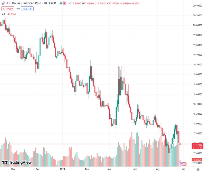 USDMXN currently trading at 17.5634 at the time of writing. Pair opened at 17.6255 and is trading with a change of -0.35 % .