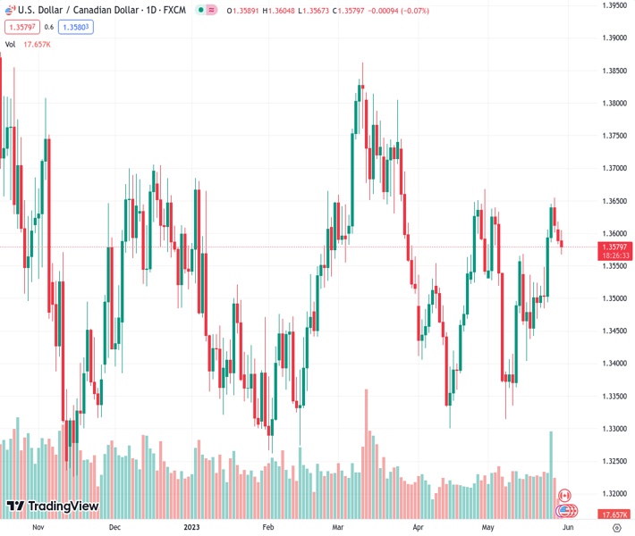 USD/CAD is under pressure in Asia with the CAD clawing back some recent declines, as a deal to temporarily suspend the U.S. debt ceiling boosted investor sentiment. USDCAD was trading 0.12% lower at 1.3572 after moving in a range of 1.3584 to 1.3618 on Monday around its weakest intraday level since April 28 at 1.3654.