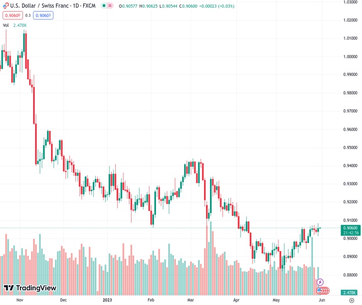 USDCHF currently trading at 0.9061 at the time of writing. Pair opened at 0.9045 and is trading with a change of 0.18 % .