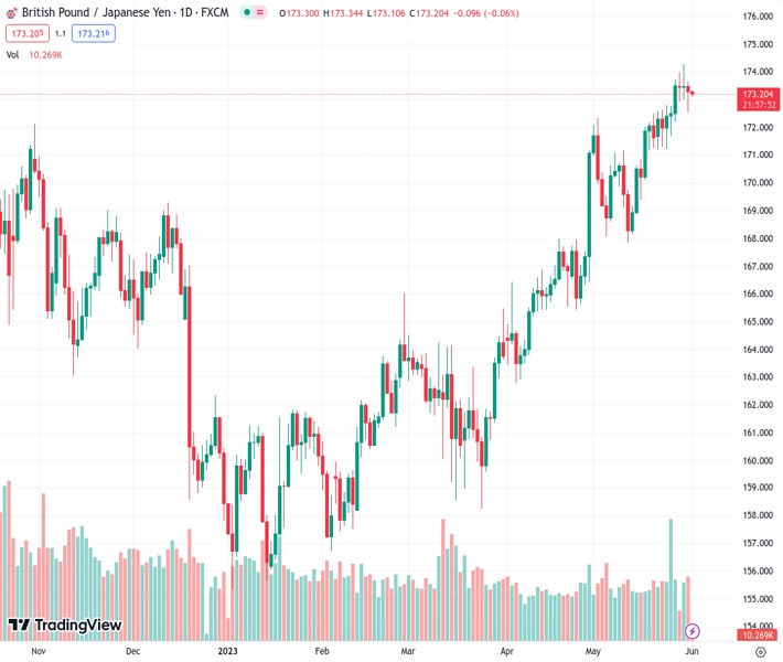 GBPJPY currently trading at 173.23 at the time of writing. Pair opened at 173.54 and is trading with a change of -0.18 % .