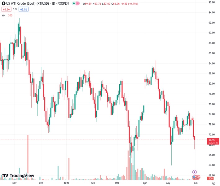 Oil price tumbles on Wednesday as doubts grow over whether the deal to raise the US debt ceiling will get voted through by Congress. A group of rebel Republicans and some Democrats too have warned they may vote against the deal. If it fails to pass and the US defaults on its obligations, financial chaos is expected, hitting Oil demand and lowering prices. That said, the US Dollar could also suffer – a positive for Oil, which is priced mainly in USD. Uncertainty over the outcome of OPEC+’s next meeting and mixed messaging from key members adds to the opaque outlook.