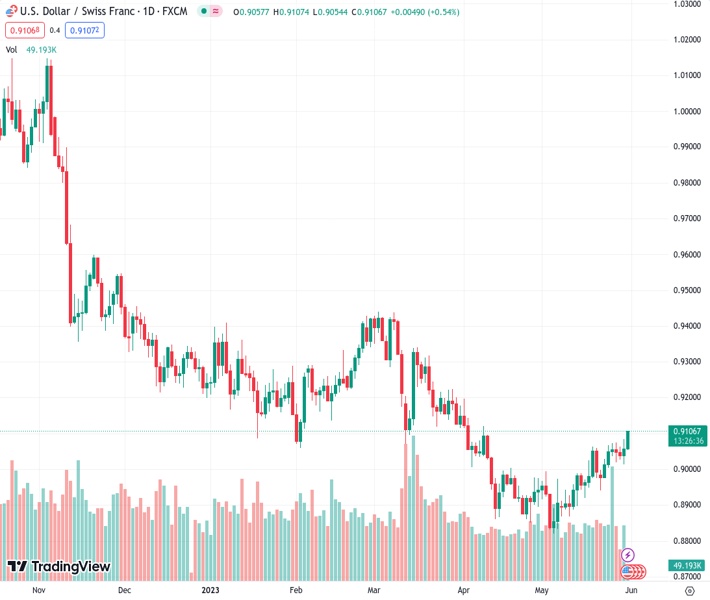 USDCHF currently trading at 0.9089 at the time of writing. Pair opened at 0.9058 and is trading with a change of 0.34% % .