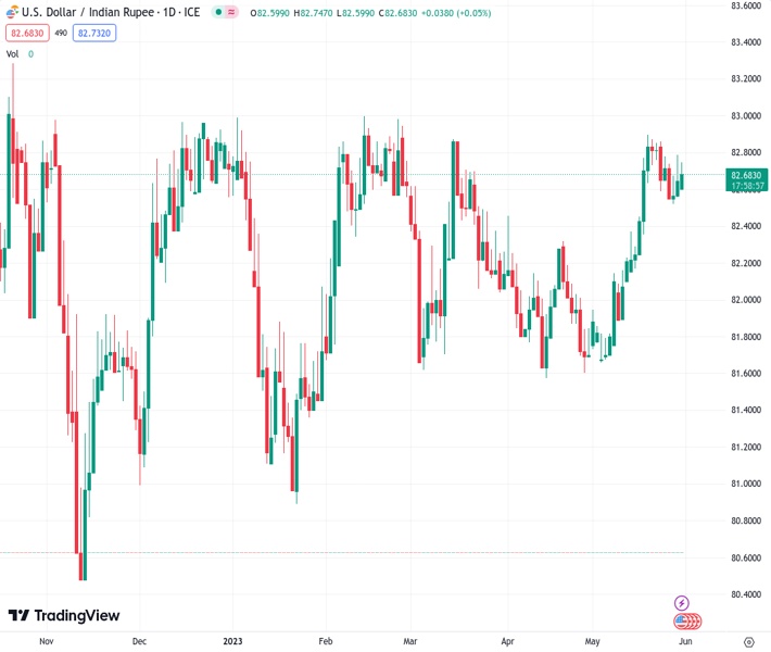 USDINR currently trading at 82.7025 at the time of writing. Pair opened at 82.6794 and is trading with a change of 0.03% % .