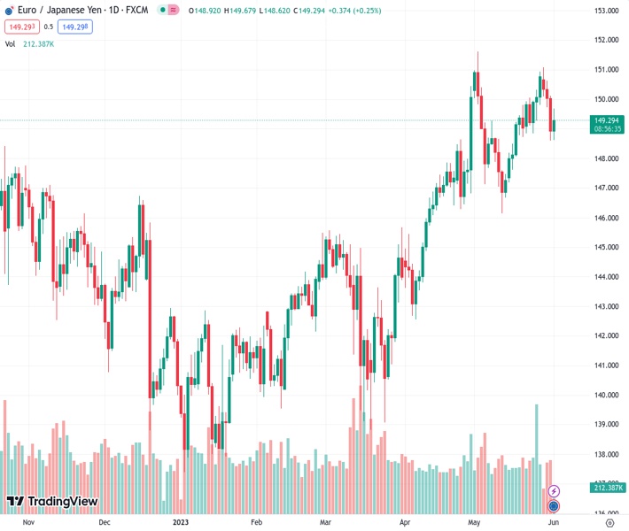 EURJPY currently trading at 149.34 at the time of writing. Pair opened at 148.94 and is trading with a change of 0.27 % .