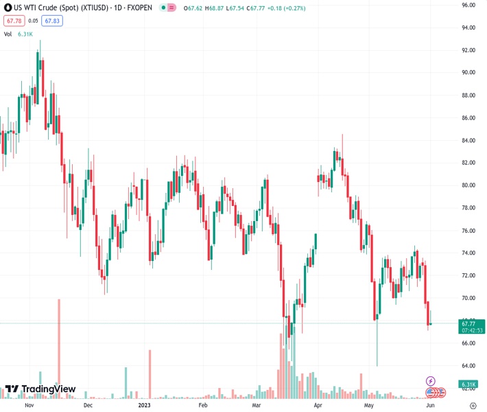 Oil price trades flat in the upper $67s (Brent in the lower $72s) on Thursday after making a small recovery from just above $67 reached the day before when sellers dominated the market. The rebound came after the US debt-ceiling extension bill was successfully voted through the House of Representatives, late on Wednesday evening. Oil price gained further support after several US Federal Reserve (Fed) officials said they thought interest rates should be left as they are at the next Fed meeting. Those gains were capped, however, after data from the American Petroleum Institute (API) showed a larger-than-expected rise in Oil inventories, indicating ample supply.