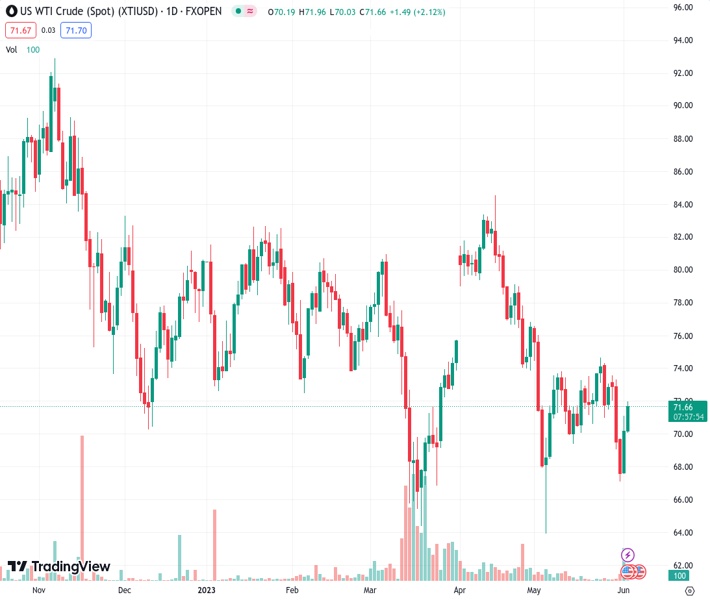 Oil price rallies for the second day on Friday as global markets breathe a sigh of relief after the US Senate votes through the debt-ceiling extension bill, vaulting the final hurdle prior to implementation. Increasing expectations that the US Federal Reserve (Fed) will pause on hiking rates at the next Fed meeting in mid-June caps the US Dollar’s progress, further helping Oil, which is priced in USD.