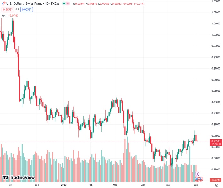 USDCHF currently trading at 0.9054 at the time of writing. Pair opened at 0.9055 and is trading with a change of -0.01% % .