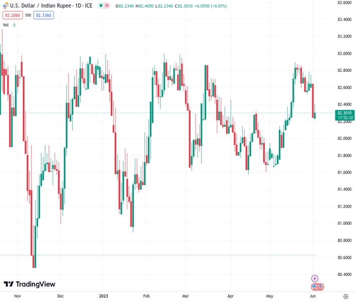 USDINR currently trading at 82.3275 at the time of writing. Pair opened at 82.2893 and is trading with a change of 0.05 % .