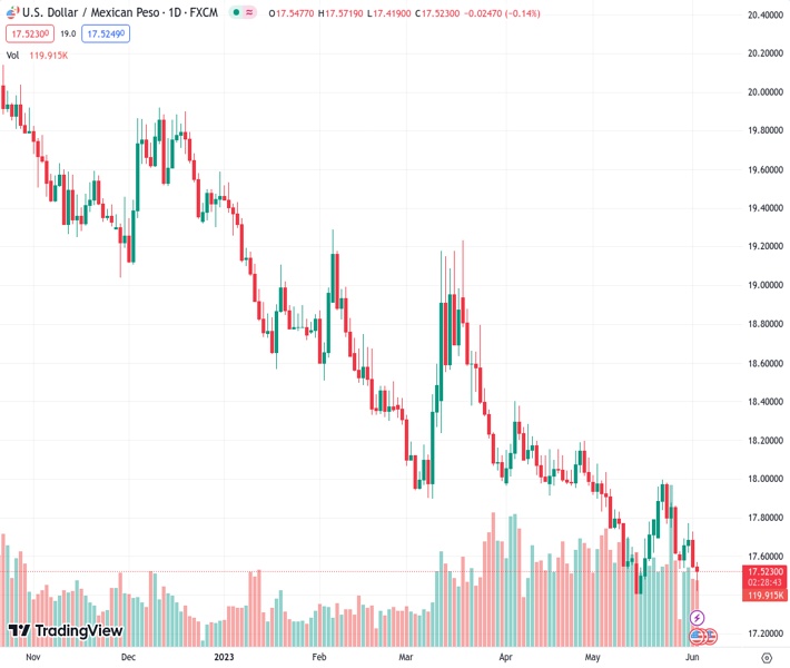 USDMXN currently trading at 17.5335 at the time of writing. Pair opened at 17.5532 and is trading with a change of -0.11 % .