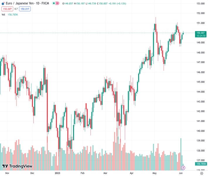 EURJPY currently trading at 150.02 at the time of writing. Pair opened at 149.78 and is trading with a change of 0.16 % .