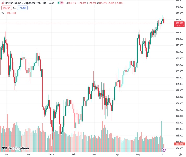 GBPJPY currently trading at 173.63 at the time of writing. Pair opened at 174.27 and is trading with a change of -0.37 % .
