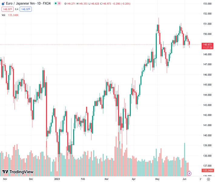 EURJPY currently trading at 149.04 at the time of writing. Pair opened at 149.31 and is trading with a change of -0.18 % .
