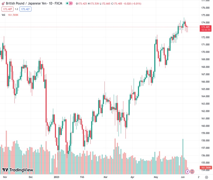 GBPJPY currently trading at 173.36 at the time of writing. Pair opened at 173.48 and is trading with a change of -0.07 % .