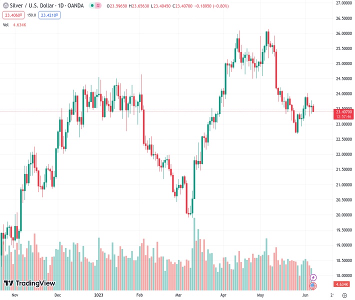 XAGUSD currently trading at 23.42 at the time of writing. Pair opened at 23.6 and is trading with a change of -0.76 % .