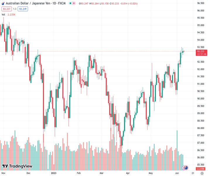 The AUD/JPY currency pair reached a daily high of 93.45 on Thursday, reflecting the strong performance of the Australian dollar. The hawkish stance of the Reserve Bank of Australia (RBA) has been a driving force behind the Aussie’s gains. On the other hand, the Japanese yen is also finding support due to cautious market sentiment and rumours of potential interventions by the Bank of Japan (BoJ).