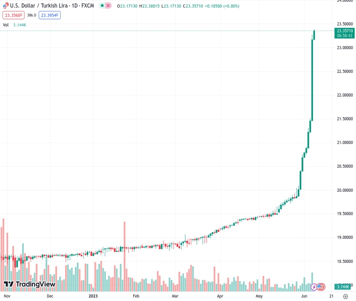 Indeed, the bearish tone in the lira remains everything but abated in a context where market participants keep monitoring the “intentional devaluation” implemented by the new economic team designated by Erdogan’s administration in the wake of the victory in the May 28 elections.