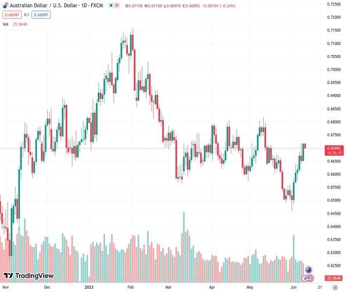 AUD/USD was last seen trading at 0.6703, down 0.21% on the day.