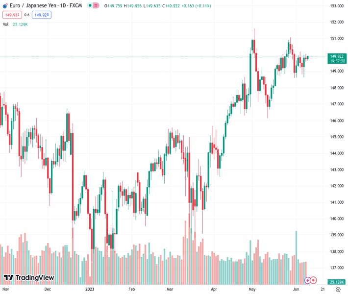 EUR/JPY’s daily chart shows the pair hugging trendline support and remaining bid while above 148.50 horizontal support.