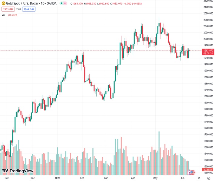 XAUUSD currently trading at 1963.0 at the time of writing. Pair opened at 1965.4 and is trading with a change of -0.12 % .