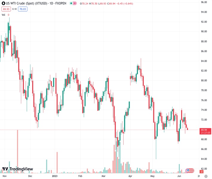 XTIUSD currently trading at 70.07 at the time of writing. Pair opened at 70.46 and is trading with a change of -0.55% % .