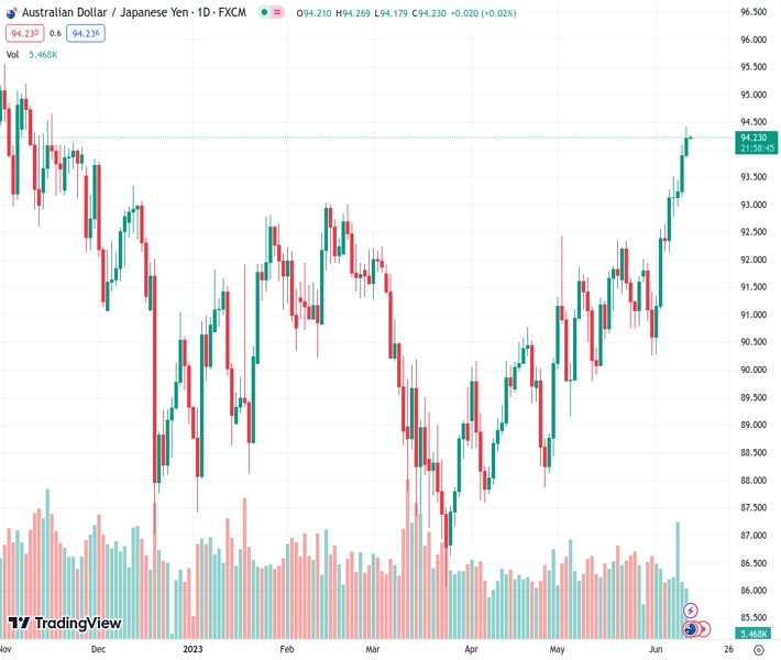 The AUDJPY is increasing and approaching its highest point of the week at 94.22, having risen for six straight days.