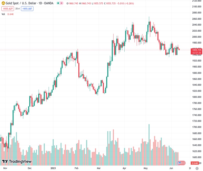 XAUUSD currently trading at 1956.28 at the time of writing. Pair opened at 1961.24 and is trading with a change of -0.25 % .