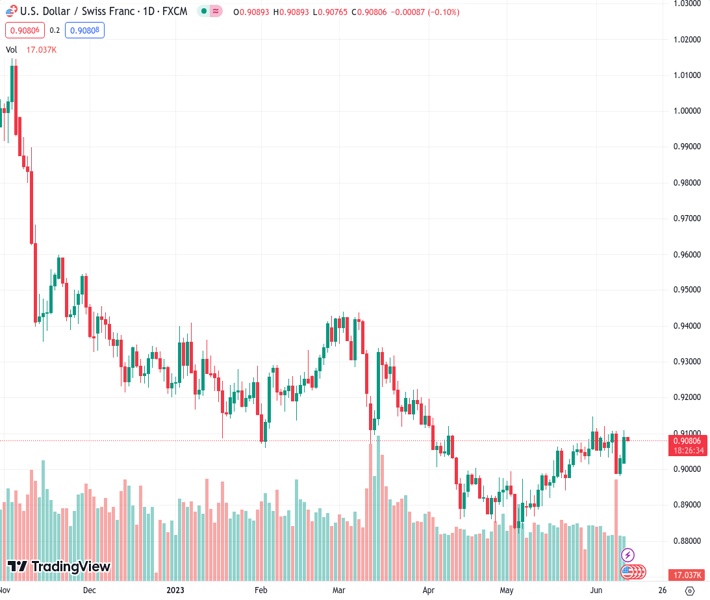 The Fed fund futures, however, indicate the possibility of another 25 bps lift-off at the July FOMC meeting. The bets were lifted by surprise rate hikes by other major central banks – the Reserve Bank of Australia (RBA) and the Bank of Canada (BoC) – last week, which suggested that the fight against inflation is not over yet. This, in turn, limit the USD losses and lends support to the USD/CHF pair.