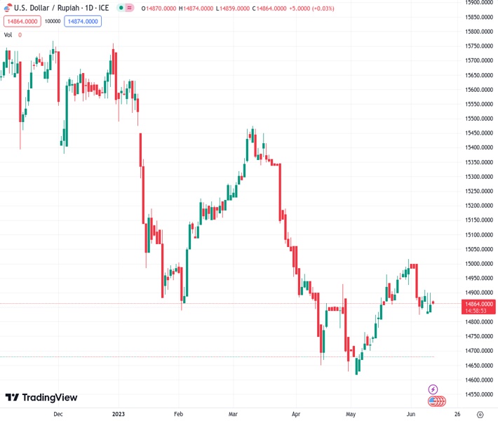 USDIDR currently trading at 14859 at the time of writing. Pair opened at 14873.25 and is trading with a change of -0.10% % .