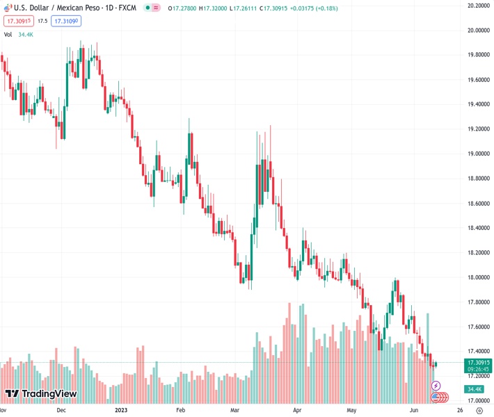 SocGen predicts that the USDMXN at 17.3101 will decrease further because it is not surpassing last week’s highest point of 17.60.