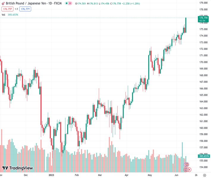 GBPJPY currently trading at 176.74 at the time of writing. Pair opened at 174.64 and is trading with a change of 1.2 % .