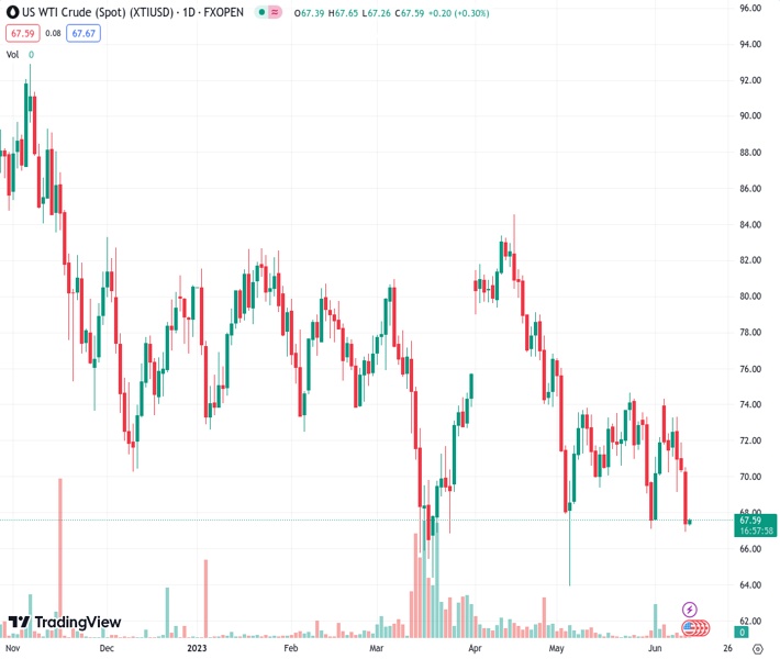 XTIUSD currently trading at 67.64 at the time of writing. Pair opened at 67.48 and is trading with a change of 0.24% % .