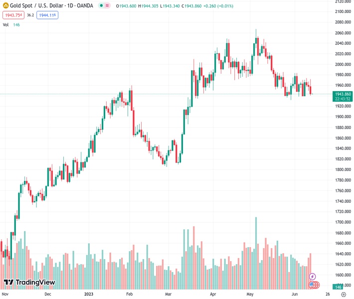 The price of gold, currently at 1,943.76 for XAUUSD, remains low as it has been trapped within a symmetrical triangle for two weeks. The recent three-day decline has added to the pressure, and as per the analysis by Nehcap, it is anticipated that there may be further decline in the near future.
