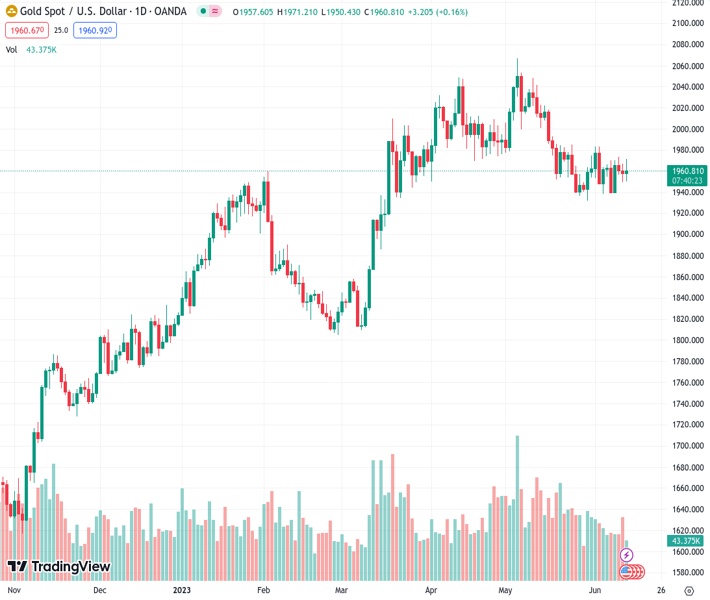The price of gold (XAUUSD) is currently at 1,961.73. The May US annual CPI has fallen to 4%, marking the lowest figure since March 2021.