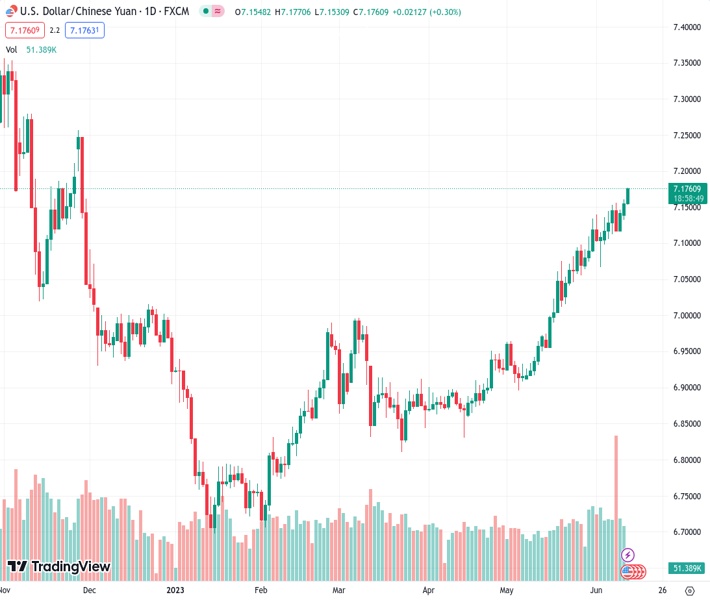 The USDCNH currency pair has experienced a rise in bids, pushing it to its highest levels since late November 2022, and this trend has continued for the third day in a row.