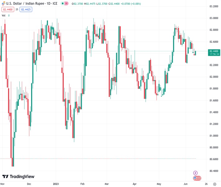 USDINR currently trading at 82.399 at the time of writing. Pair opened at 82.3435 and is trading with a change of 0.07% % .