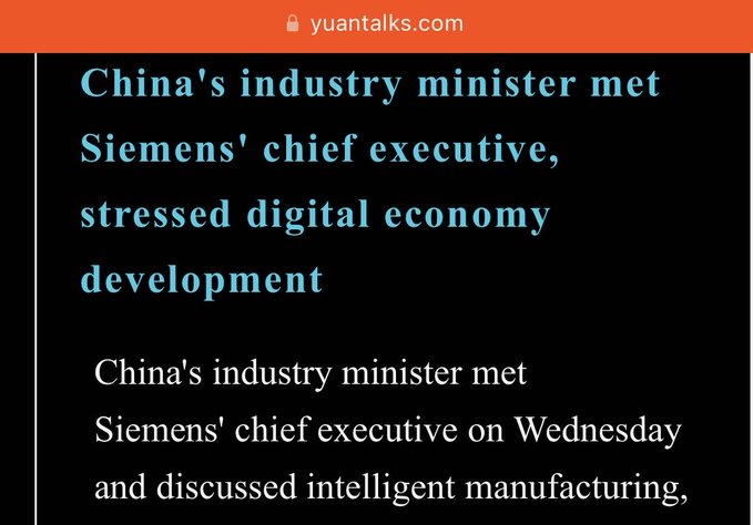 The industry ministry of China held a meeting with the CEO of Siemens, during which they focused on the development of the digital economy. [/s2If]