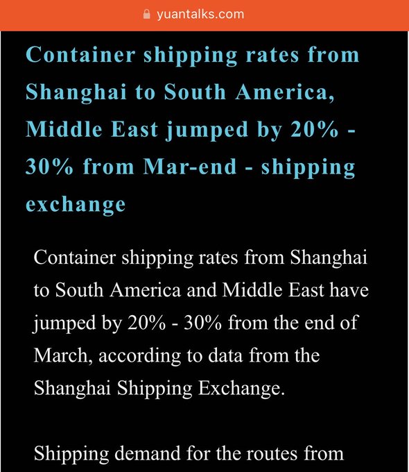 Rates for shipping containers from Shanghai to South America and the Middle East have increased by 20% to 30% since the end of March. [/s2If]