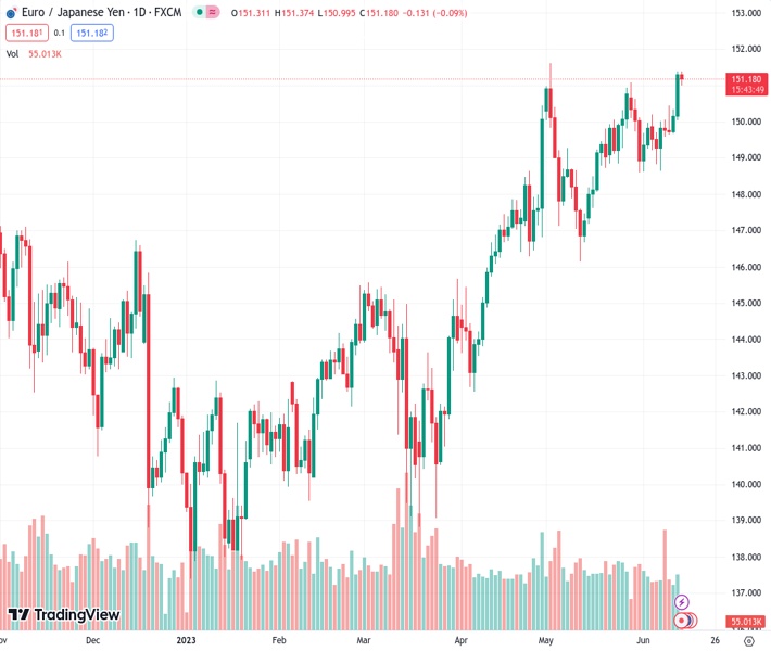 EURJPY currently trading at 151.17 at the time of writing. Pair opened at 151.34 and is trading with a change of -0.11 % .