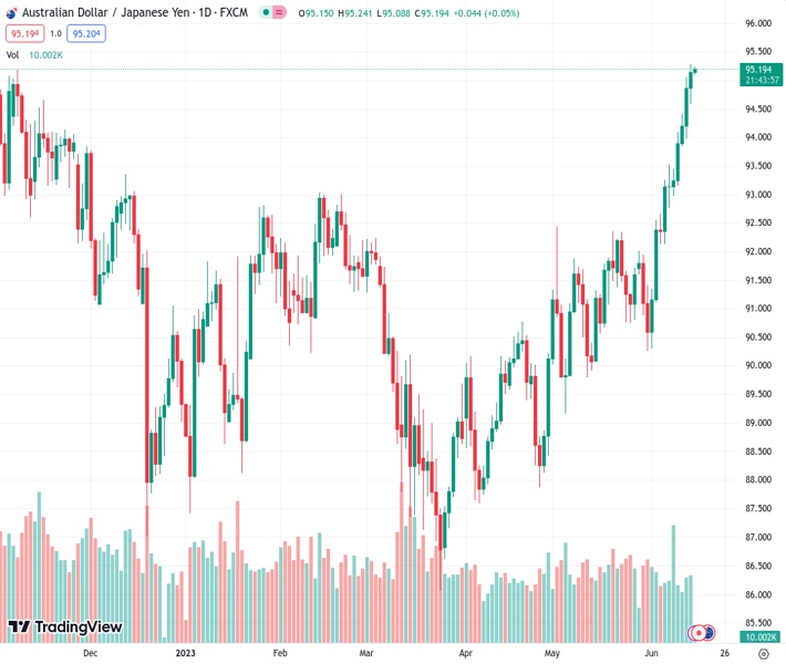 AUDJPY currently trading at 95.18 at the time of writing. Pair opened at 94.88 and is trading with a change of 0.32 % .