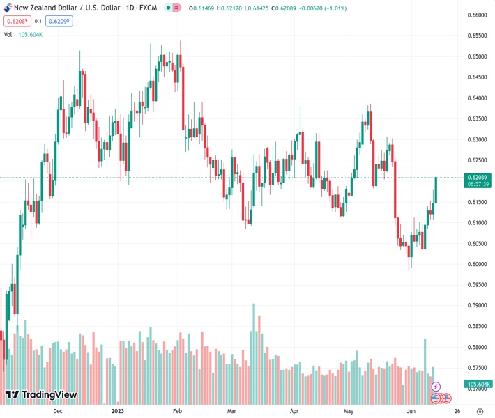The NZD/USD pair has demonstrated a solid rally to the round-level resistance of 0.6200 as the US Dollar Index (DXY) has fallen like a house of cards. The Kiwi asset has been strengthened as May’s United States Producer Price Index (PPI) has cooled down due to lower gasoline prices.